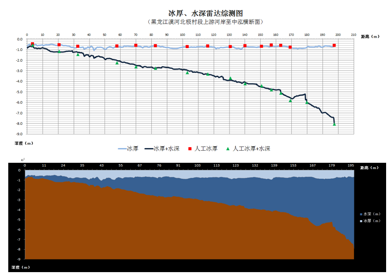 圖3 雷達獲取的高精度冰厚水深綜合斷面圖(與傳統(tǒng)方法測量數(shù)字比對,測量結(jié)果更精準(zhǔn))